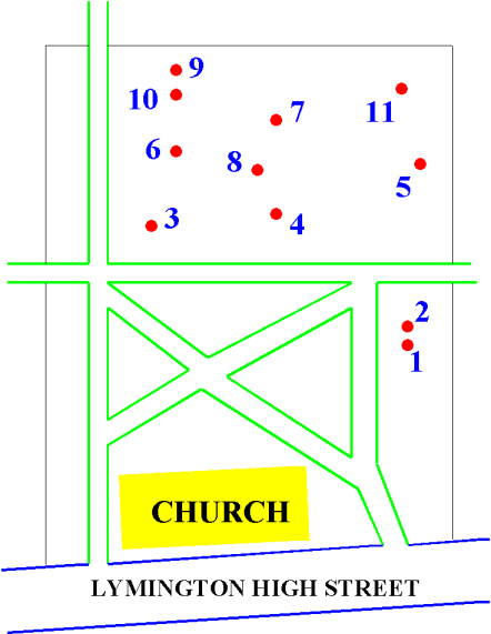 There are at least eleven Hapgood graves in the churchyard of St Thomas', the parish church of Lymington (grid reference SZ 322955). The sketch map below left shows the locations of these graves (as noted by the author during various visits in the early 1980s). The green lines indicate paths through the churchyard whilst thin black lines indicate the boundaries of the churchyard. The red dots indicate Hapgood graves while the blue numbers are references to the table below right: