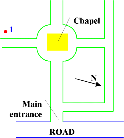 There is at least one Hapgood grave in the Lymington Civil Cemetary(grid reference SZ 313954). The sketch map on the left below shows its location (as noted by the author during a visit on 2 November 1980). The green lines indicate paths through the cemetary. The red dot indicates the Hapgood grave while the blue number is a reference to the table below right: