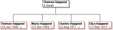 Thomas and Sarah were one of two Hapgood families living in Lymington at the beginning of the nineteenth century. The date and place of their marriage is not known. They are known to have had at least four children as shown in the family tree below.